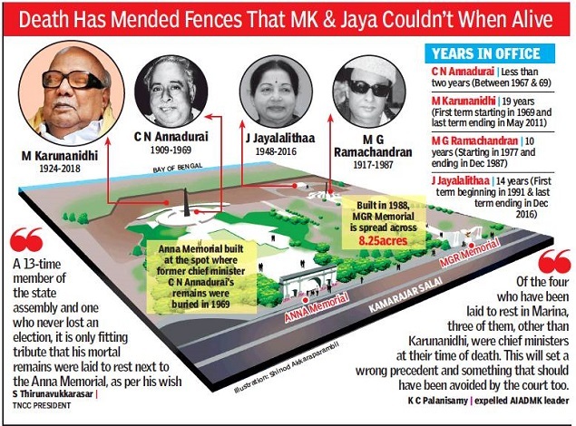 And they cannot ignore that his other neighbours are MGR and J Jayalalithaa. The midnight court battle over allocating space on Marina brought out the old bitterness between Karunanidhi and Jayalalithaa, but death seems to have mended fences the leaders couldn’t when alive. When it comes to MGR, however, DMK cadres don’t feel so bad. After all, the two leaders have been more than civil even after their political split.