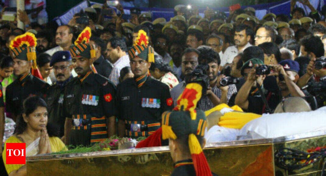 His family and close party functionaries followed the procession on foot, undertaking the 1.5km journey from the hall to Anna Memorial via Sivananda Salai and Kamarajar Salai. At 6.13 pm, the procession reached Marina, where various leaders paid their tribute to the DMK patriarch. As his casket was lowered in the ground, people beat their chests and cried.